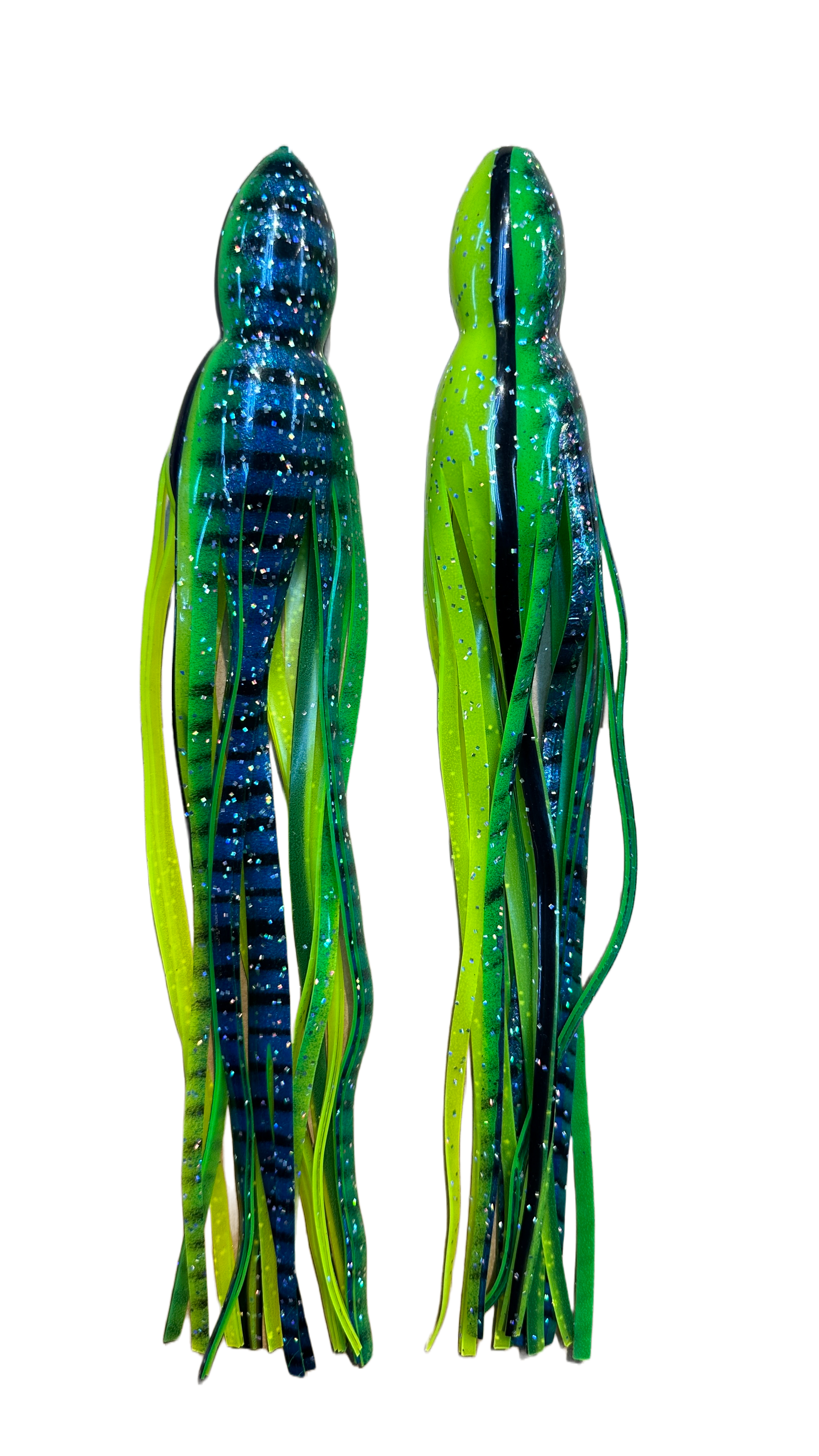 Green/yellow base w/ black lateral lines, holo flakes, & blue aurora